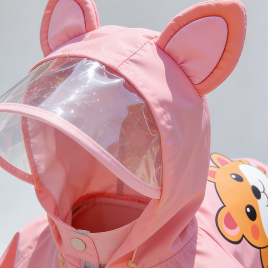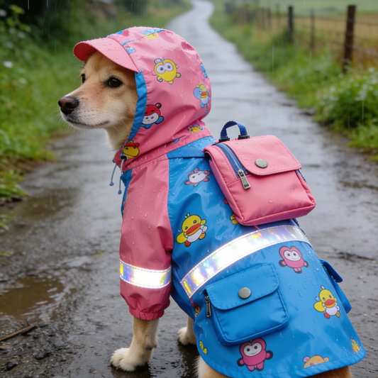 Cartoon Print Dog Raincoat with Backpack - Pink & Blue Waterproof Cape with Reflective Strips for Medium Dogs