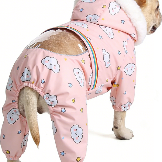 Cloud Rainbow Fleece-Lined Dog Raincoat - Pink Waterproof Full-Body Jumpsuit for Medium Dogs (French Bulldog, Corgi)
